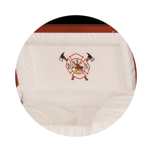 You may choose to honor a fallen firefighter with a special casket designed with them in mind. This red, 20-gauge-steel casket has a white interior with firefighter imagery designed to pay homage to your loved one’s service.