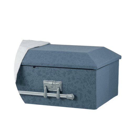 Caskets in this collection are wrapped in a gray/blue color with a subtle pattern to add texture and dimension. They feature reinforced stationary handles, white crepe interior, and a bed that is adjustable at the head.