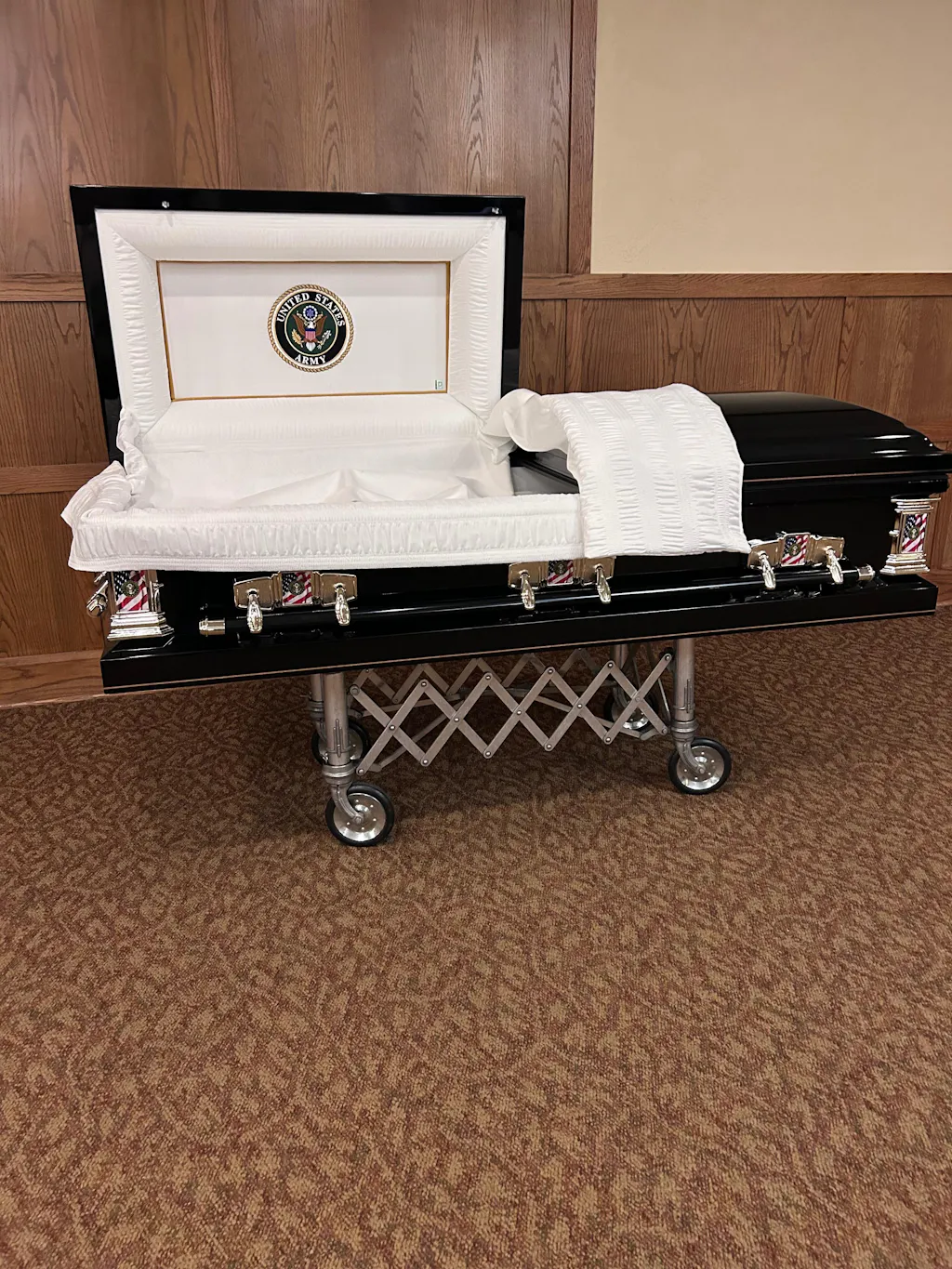 The reinforced swingbar handles pull up and away from the casket when in use which allows for easier transport.