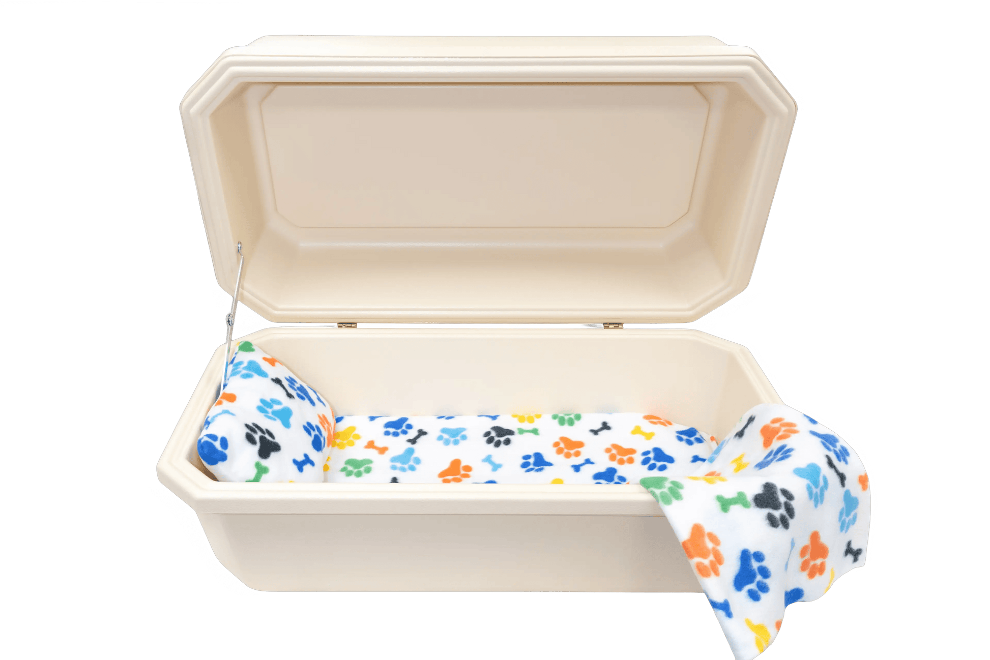 - 🐾 FLEECE INTERIORS. This casket comes equipped with Rainbow Paw fleece pad and a blanket for the comfort of your pet