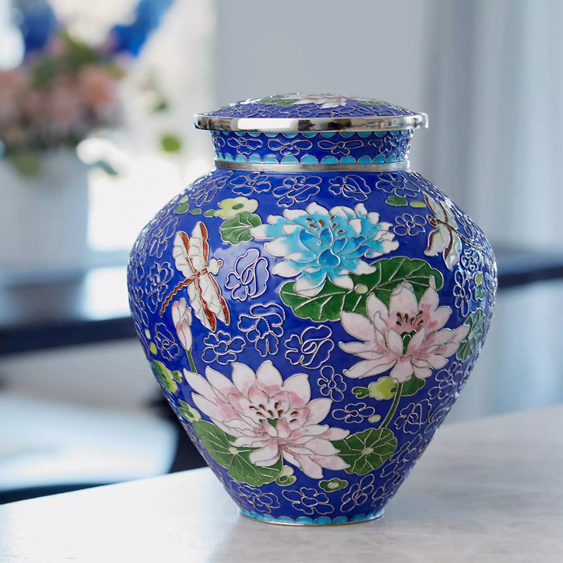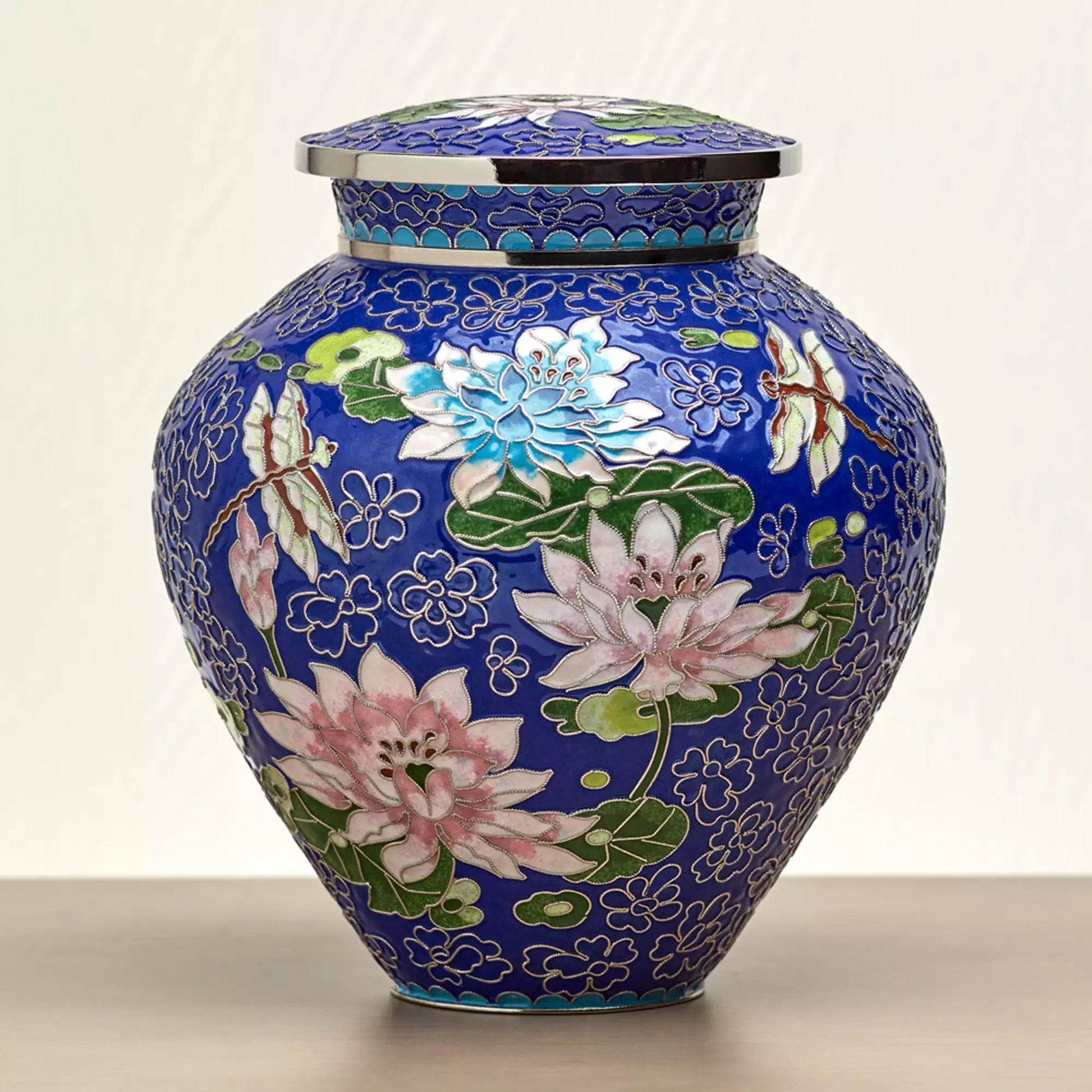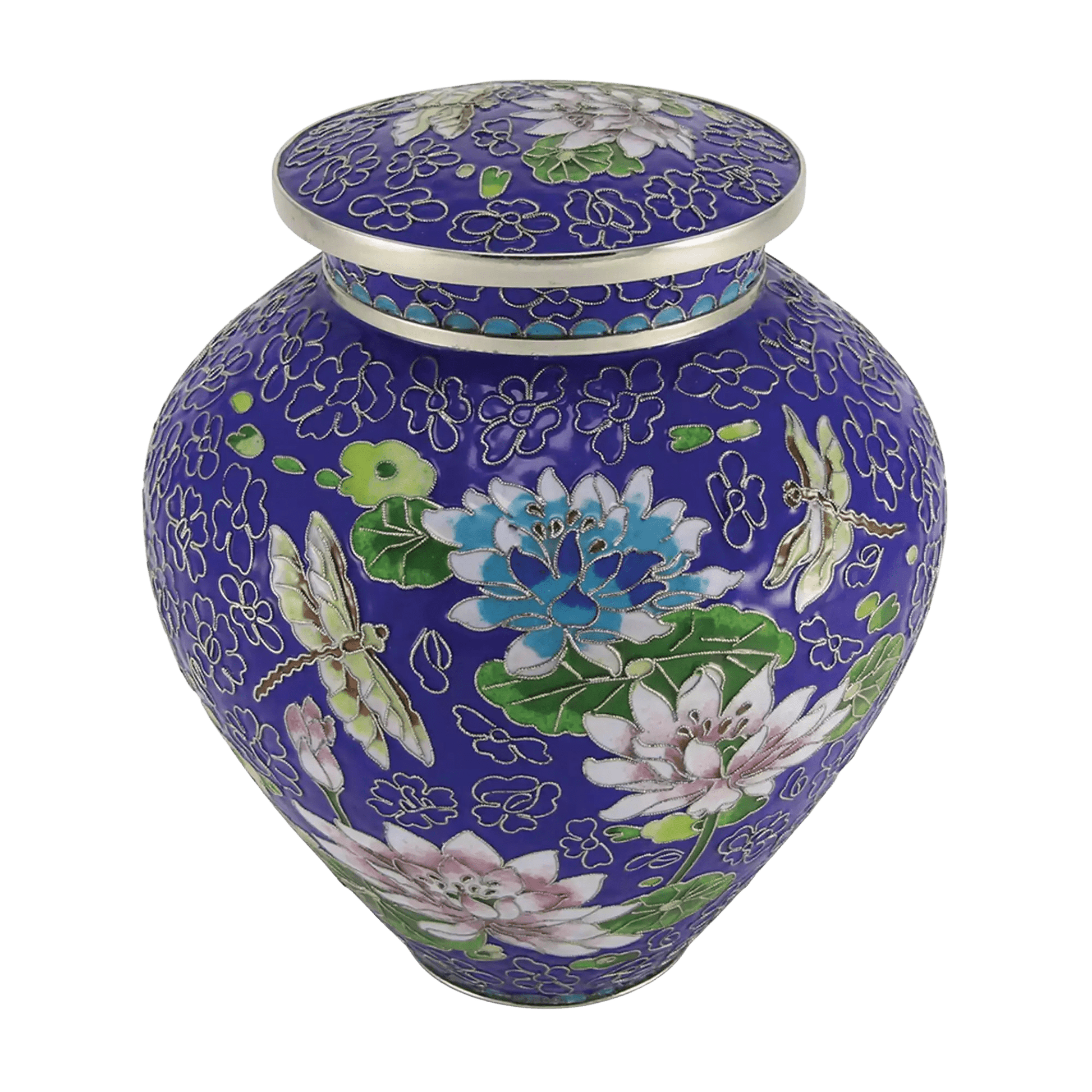 Introducing our Filigree Cloisonné urns, a distinct and meaningful way to honor your loved ones. These urns are a special variation of cloisonné art, featuring raised metal accents that impart a tactile dimension to their beauty. The Lily Dragonfly design transports you to the serenity of a tranquil pond. It captures the essence of a calm water surface adorned with lily pads, blooming flowers, and dragonflies in flight, evoking a sense of peaceful contemplation. These Filigree Cloisonné urns are not just exquisite works of art but also vessels of deep significance. They provide a touching and visually captivating way to commemorate the memory of your loved ones. With each urn, you can pay tribute to their unique personality and the profound connection you shared, creating a beautiful and meaningful remembrance of their legacy.