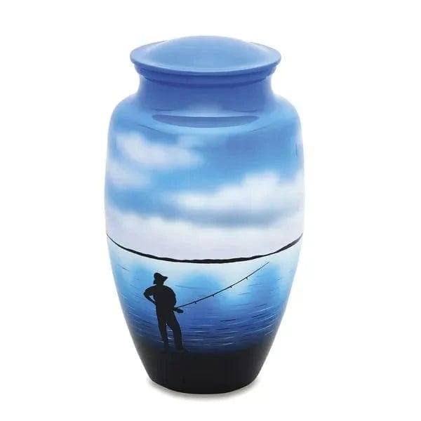 • Introducing the Fisherman Adult Cremation Urn, a poignant tribute that captures the serenity of a fisherman patiently awaiting a nibble. This urn features a hand-painted scene with the silhouette of a solitary fisherman, evoking a sense of peacefulness and reflection.