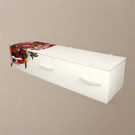 Features a soft white finish adorned with vibrant, lifelike roses, creating a warm and peaceful tribute.