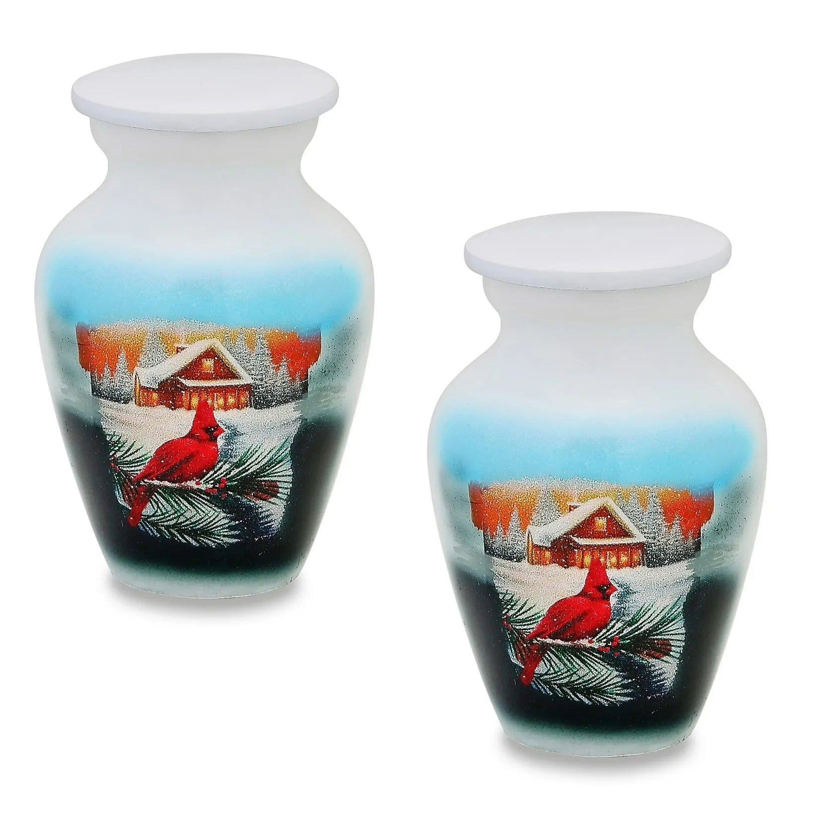 The Cardinal Keepsake Urn , from our new signature artist series, showcases a serene snowy scene with a vibrant red cardinal perched on a tree limb. This exquisite artwork captures the beauty of nature and symbolizes peace and remembrance. Crafted from 100% aluminum, the Cardinal Keepsake Urn is both durable and lightweight, ensuring the safekeeping of your loved one's ashes.