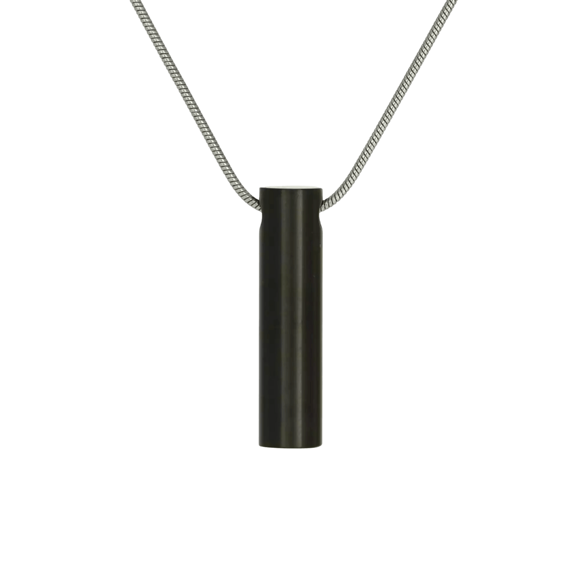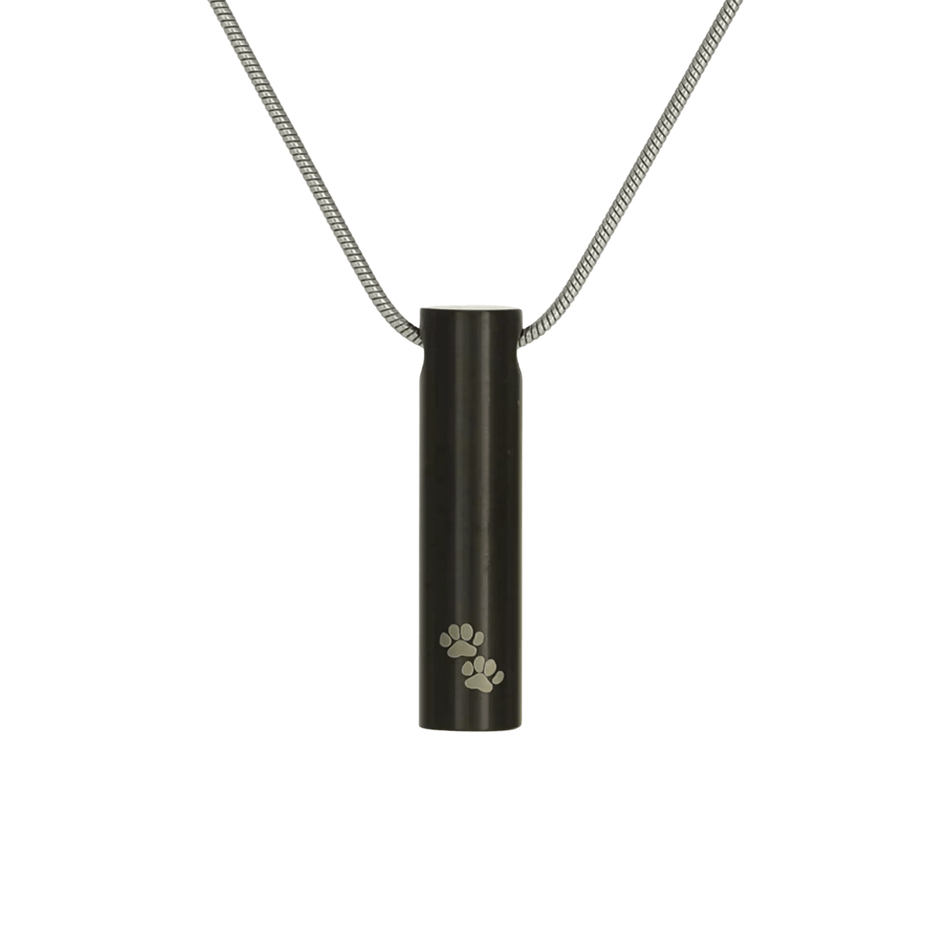 The Paw Print Cylinder is a distinctive piece of remembrance, meticulously crafted from robust 316 stainless steel and presented in an elegant black plating (onyx) finish. It arrives complete with a 19-inch stainless chain, making it a convenient and stylish accessory for honoring your beloved pet's memory.