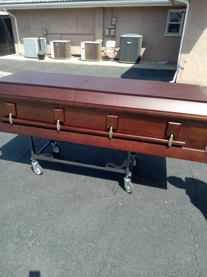 The reinforced swingbar handles pull up and away from the casket when in use which allows for easier transport.