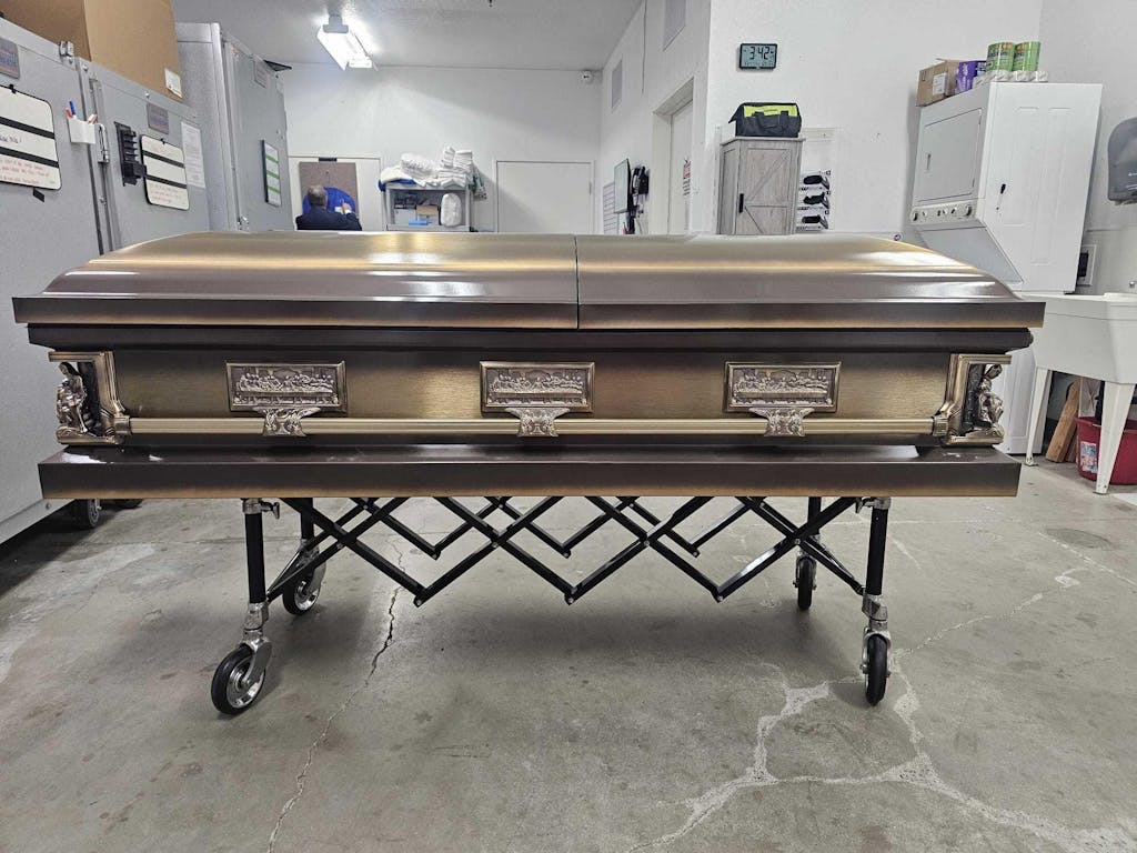 - BRUSHED FINISH. The casket’s steel exterior is a beautiful brushed bronze color.