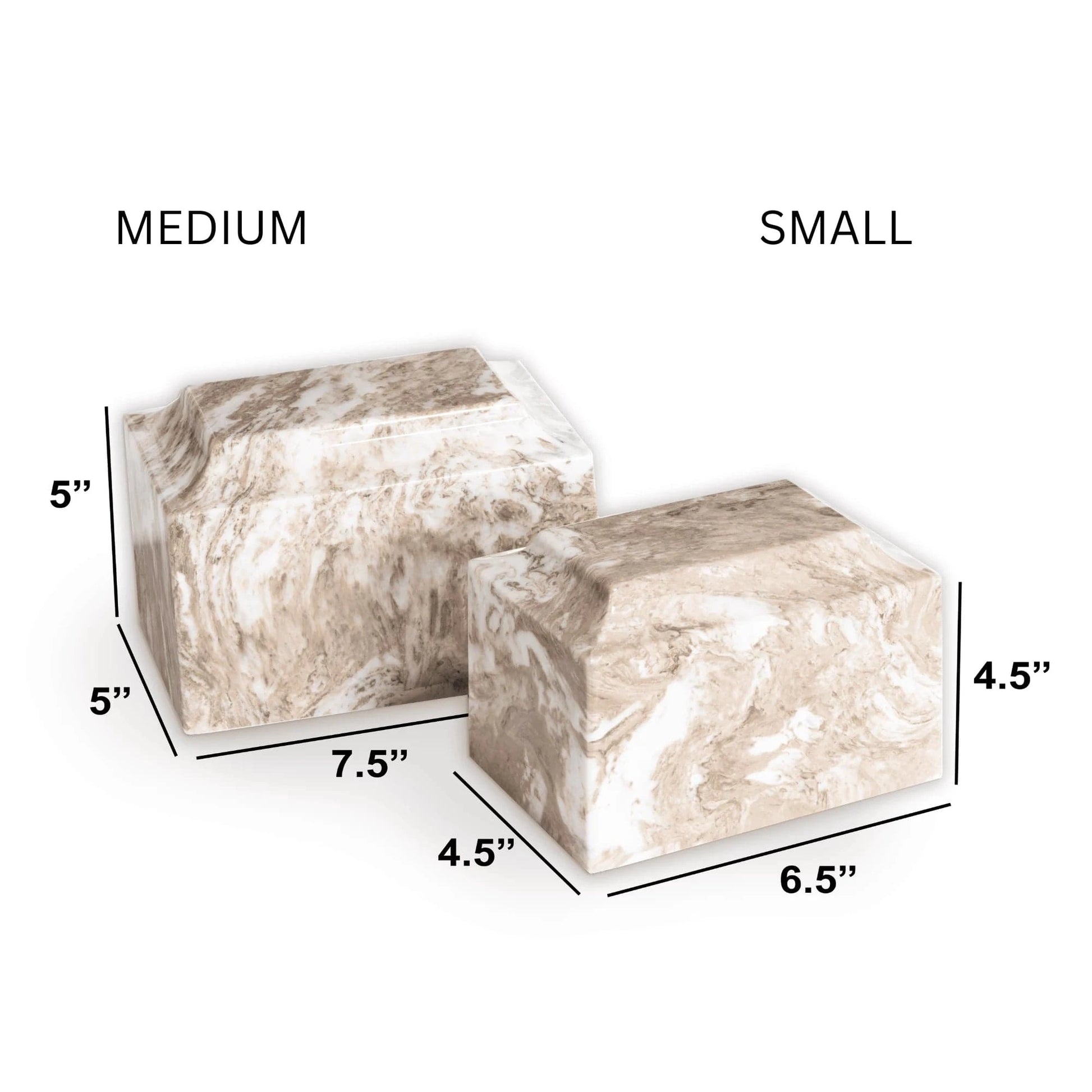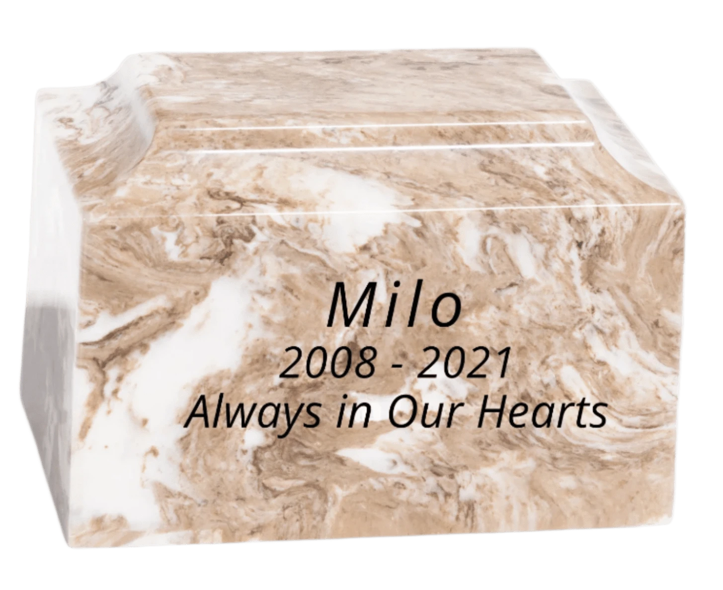 Made from a blend of marble dust, resin, and pigments, this urn captures the elegance of natural marble while ensuring exceptional durability. It can be displayed at home, placed in a columbarium, or buried without requiring an additional vault, meeting most cemetery regulations for pet burials.
